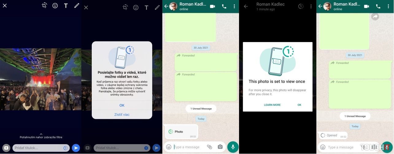 Odoslanie jednorazovej fotografie funguje takmer identicky s tradičným posielaním fotiek. Cez rozhranie četu si vyberiete fotku, ktorú chcete odoslať, avšak pred jej poslaním ťuknete na novú ikonku „1“. Tá sa nachádza hneď vedľa tlačidla na odoslanie.