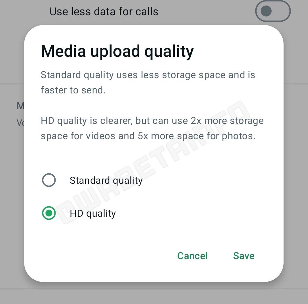 V WhatsApp sú aktuálne dostupné tri spôsoby, ako poslať rovnakú fotografiu: v pôvodnej kvalite (ako dokument), v štandardnej predvolenej kvalite a v HD kvalite. Tieto možnosti dobre vystihuje tento príklad: fotka s pôvodnou veľkosťou 8064 × 6048 pixelov je pri štandardnom odoslaní zmenšená na 2048 × 1536 pixelov, ale pri HD kvalite na 5120 × 3840 pixelov.