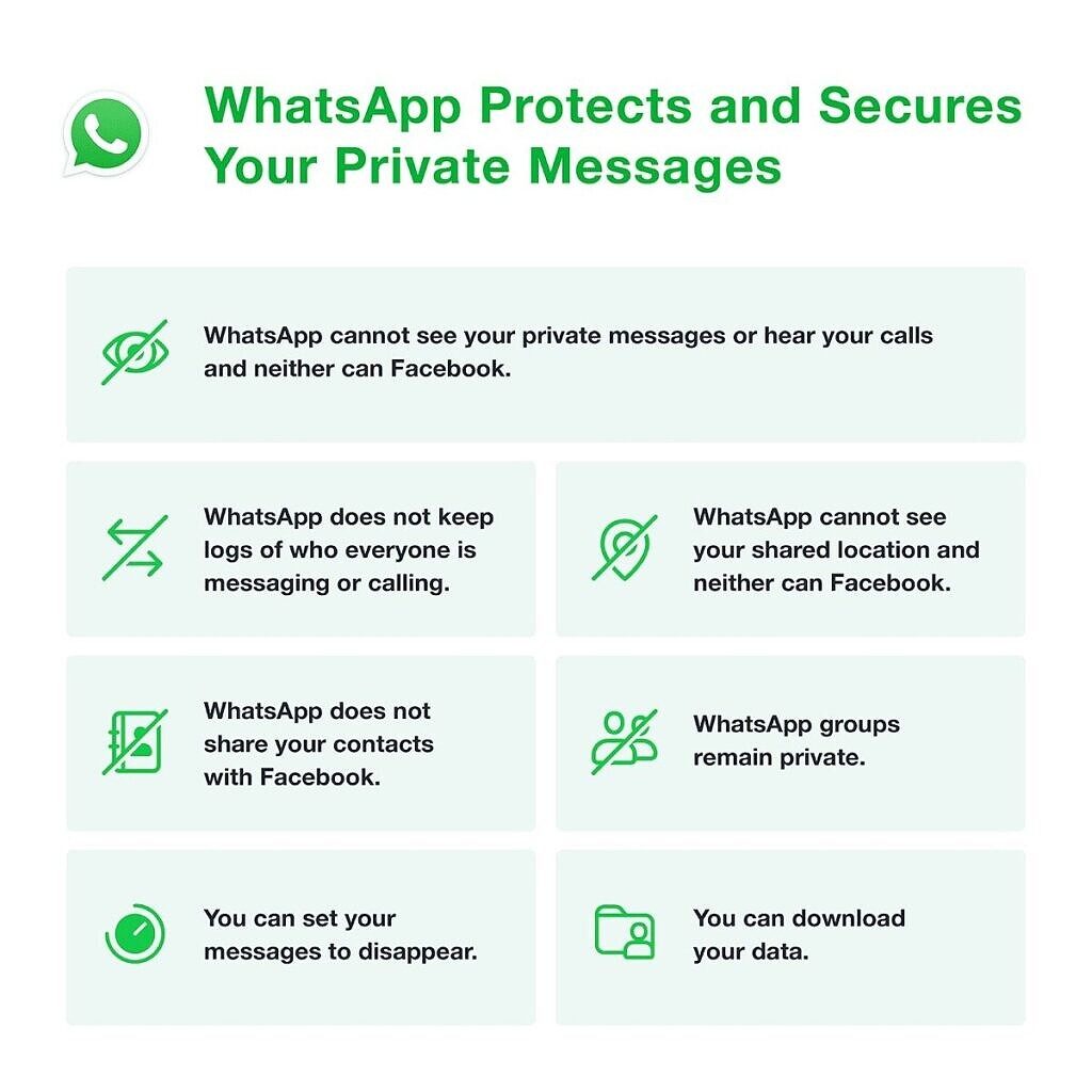 WhatsApp nedávno aktualizoval podmienky a pravidlá ochrany osobných údajov, čo umožní zdieľanie údajov so všetkými službami z rodiny Facebooku. To vytvorilo medzi používateľmi aplikácie na celom svete rozruch a mnohí migrovali na alternatívy ako sú Signal alebo Telegram. Portál XDA-Developers informuje, že zmena politiky tiež vyvolala určité obavy z agendy Facebooku a zrodila niekoľko zavádzajúcich fám, ktoré urýchlili odliv používateľov. Zmeny sa týkajú hlavne USA, no mierne modifikované zmeny sú prakticky totožné aj pre európskych používateľov. V snahe zachrániť negatívny vývoj zverejnil WhatsApp odpovede na niektoré z najčastejšie kladených otázok týkajúcich sa jej opatrení na ochranu osobných údajov a politiky zdieľania údajov. Komunikačná platforma, ktorú vlastní Facebook, nedávno aktualizovala sekciu FAQ, v ktorej zdôraznila, ako bude naďalej chrániť súkromné správy, a to aj napriek tomu, že sa hovorí o opaku. WhatsApp uvádza, že aktualizácia politiky „nijako neovplyvňuje súkromie správ. Namiesto toho táto aktualizácia obsahuje zmeny týkajúce sa zasielania správ podnikom na WhatsApp, ktoré sú voliteľné, a poskytujú ďalšiu transparentnosť v tom, ako zhromažďujeme a používame údaje.“