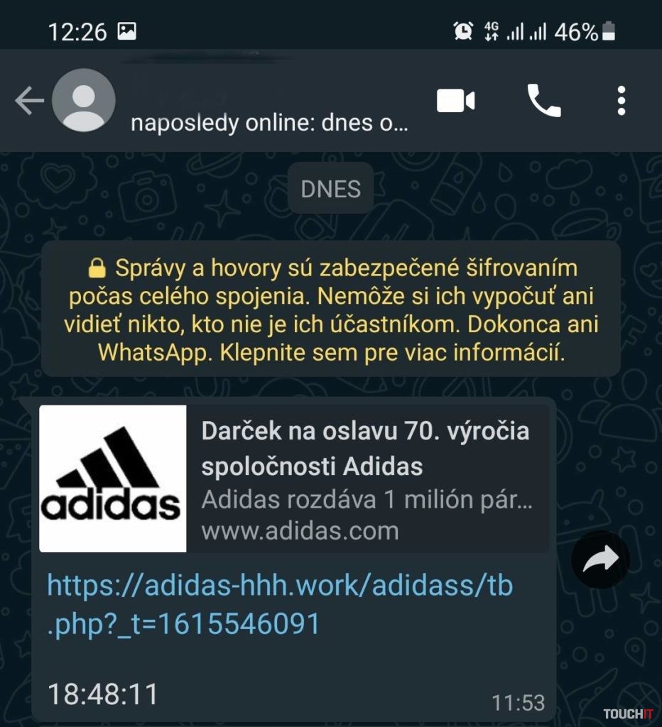 sa pritom stačí zúčastniť “ obyčajného losovania„. Pre vyvolanie väčšieho napätia je po otvorení stránky dokonca spustená časomiera, ktorá má prinútiť používateľa ihneď konať. Po istej výhre sa zobrazí oznam o potrebe jej zdieľania prostredníctvom WhatsAppu, aby ste si na údajnú výhru mohli nárokovať. Nárokovanie výhry je podľa popisu prinajmenšom zvláštne. O podozrivom pôvode stránky napovedá aj čierny riadok s logom Adidas, v ktorom sú všetky položky nefunkčné. To znamená, že sa nedostanete do ponuky, košíka a ani nedokážete použiť vyhľadávanie. Odporúčame preto na tieto a podobné linky neklikať a nezdieľať ich.