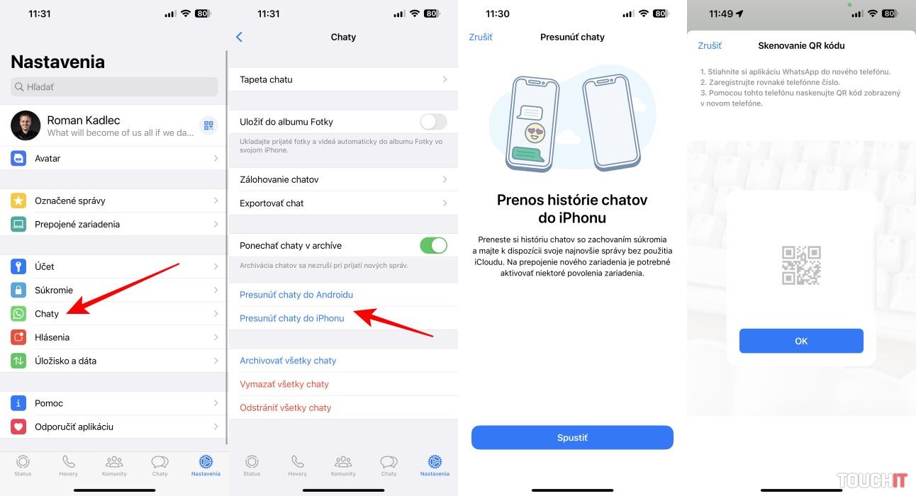 Pozornému oku neujde fakt, že v nastaveniach četov sa zobrazujú možnosti na presun do iPhonu aj do Androidu. Platí však, že nový spôsob prenosu dát naskenovaním QR kódu funguje iba v prípade, že prenášate čety zo starého telefónu na nový smartfón s rovnakým operačným systémom.
