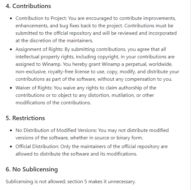 Kameňom úrazu je však licencia, ktorá zakazuje následnú distribúciu takto upraveného kódu. Dá sa to chápať aj ako ochrana vývojárov proti vzniku množstva projektov, ktoré nebudú vo výsledku odkazovať na pôvodný prehrávač. Je to však ale zároveň zabijak komunity, ktorá by sa mohla pokúsiť tento prehrávač oživiť. Nakoniec, trh by rozhodol a tie najlepšie distribúcie by si našli cestu medzi používateľov.