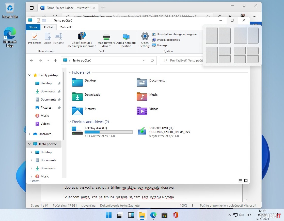 Inštalácia systému z ISO obrazu nezabrala viac ako 5 minút na SSD disku. Celkovo však aj kvôli použitiu off-line účtu. Sprievodca je animovaný a má veľmi pekné prvky. V rámci nastavení sme zvolili základnú konfiguráciu, aby sme videli, aké sú rozdiely vo výkone na slabej zostave. Išlo o počítač s 2 GB RAM, 60 GB SSD diskom a jedným procesorom s dvomi jadrami, hoci reálny procesor má štyri jadrá. Sprievodca nastavením je veľmi podobný tomu, ako pri Windows 10, zbadáte ale novú grafiku. V tomto smere ide o viditeľné zlepšenie dojmu celého systému. Celkové možnosti a to ako na nás systém vplýval, by sme prirovnali k Windows 95 a prechodu na Windows 98 či možno Windows Me. S týmto sme spokojní. Je tu nové číslovanie operačného systému, takže očakávame niečo nové, no v zásade chceme stále svoj Windows poznať. Z nášho pohľadu nejde o tak dramatickú zmenu ako v prípade z prechodu Windows 98 / 2000 na Windows XP. Tam bol vizuál citeľnejší. Keď sa vrátime k inštalácii, tu vás poteší detail a to je zlepšenie vizuálu už v počiatočnom štádiu. Netreba spustiť systém, aby sa prejavila grafika roku 2021 tak, ako to bolo v minulosti. Teda kostrbaté písma, základné farby a všetko graficky prívetivejšie, sa zobrazilo až po vstupe do Windows prípadne po inštalácii už vo forme animovaného štartovacieho loga. Na čo sa vlastne nový systém podobá? Minimálne sa tu začali prejavovať prvky Fluid dizajnu, no ešte stále len v prechodnom stave. Vo svojej podstate si vizuál z veľkej časti prevzal z systému Windows 10X. Podobá sa na Chrome OS, možno trochu na Linux a centrovaním prvkom na Paneli úloh je tu jednoznačne podoba s macOS. Prvky sa dajú zarovnať doľava, tak ako sme boli po všetky generácie Windows zvyknutí. Zarovnanie doprostred môžete mať už aj teraz, stačí použiť doplnok CenterTaskbar, ktorý si stiahnete tu. Slovenčina nie je v tejto verzii dostupná počas inštalácie, dá sa ale nainštalovať cez pridanie jazykového balíka a nastaviť ako predvolený jazyk rozhrania. Stále však bolo takmer všetko v angličtine, teda v jazykovej verzii, v ktorej sme systém inštalovali. Niektoré popisy alebo tlačidlá už lokalizáciu mali, aplikácie zatiaľ zostávali v anglickej mutácii. Čiže napríklad Notepad namiesto Poznámkový blok atď.