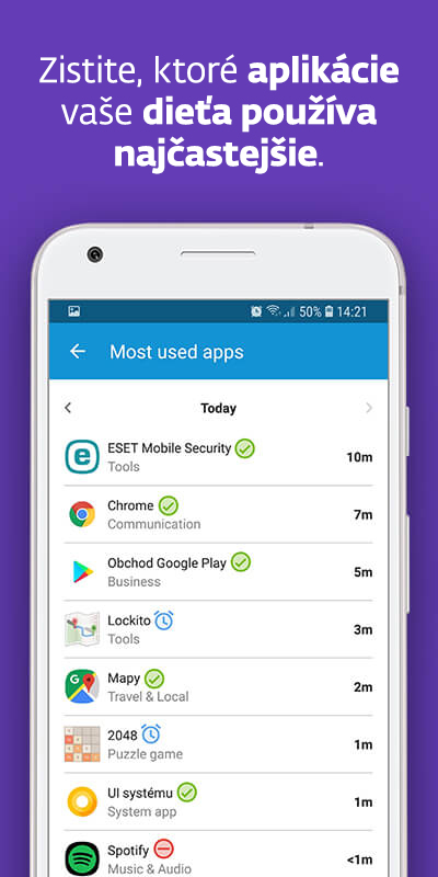 Na smartfónoch sa dá použiť aplikácia ESET Parental Control. Aplikácií podobných tej od ESETu je množstvo. Na začiatok odporúčame použiť práve túto. Je slovenská, máte k nej slovenskú podporu a je prispôsobená na komunikáciu s deťmi. Funguje tak, že si z obchodu Google Play stiahnete aplikáciu.