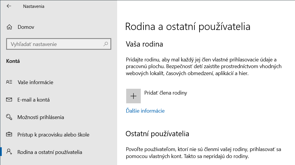 Nastavenia – Kontá – Rodina a ostatní používatelia – Pridať člena rodiny.