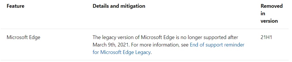 Po novom ale zo systému starý Edge zmizne a stane sa to nainštalovaním kumulatívnej záplaty, ktorej plánované vydanie bude na 13. apríla 2021. Toto sa dotkne systémov s označeniami verzií 1809, 1903, 1909, 2004 a 20H2. Verzia Windows 10 21H1 už teda bude len s Edge na báze Chromium a Internet Explorerom.
