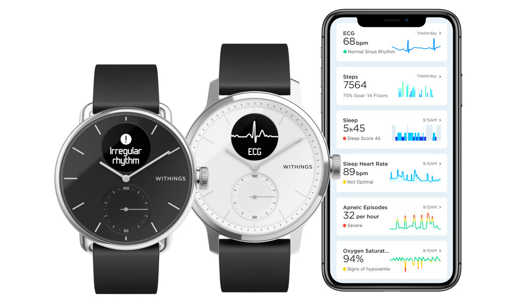 Withings ScanWatch sú prvé klinicky overené hybridné inteligentné hodinky, ktoré môžu pomôcť pri detekcii arytmie (AFib) a spánkového apnoe. AFib – nepravidelný rytmus srdca môže viesť k zrážaniu krvi a mozgovej príhode.