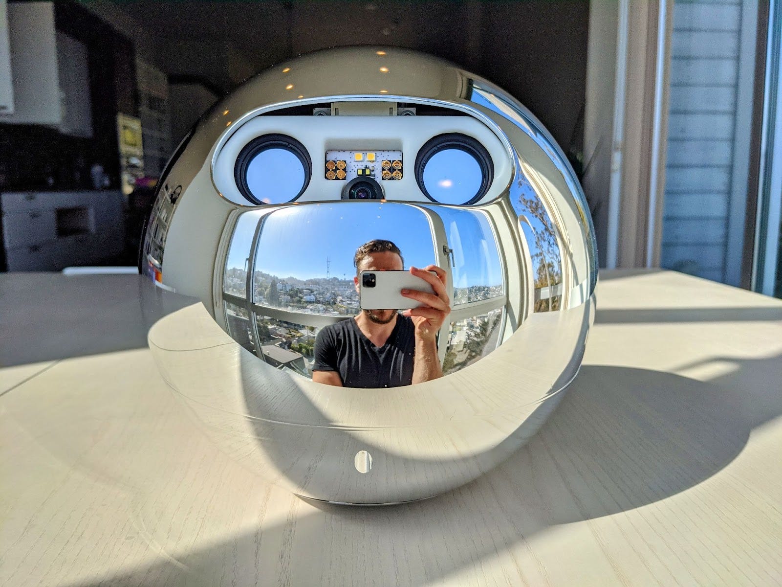 Kovový orb, ktorý zbiera snímky očnej dúhovky.