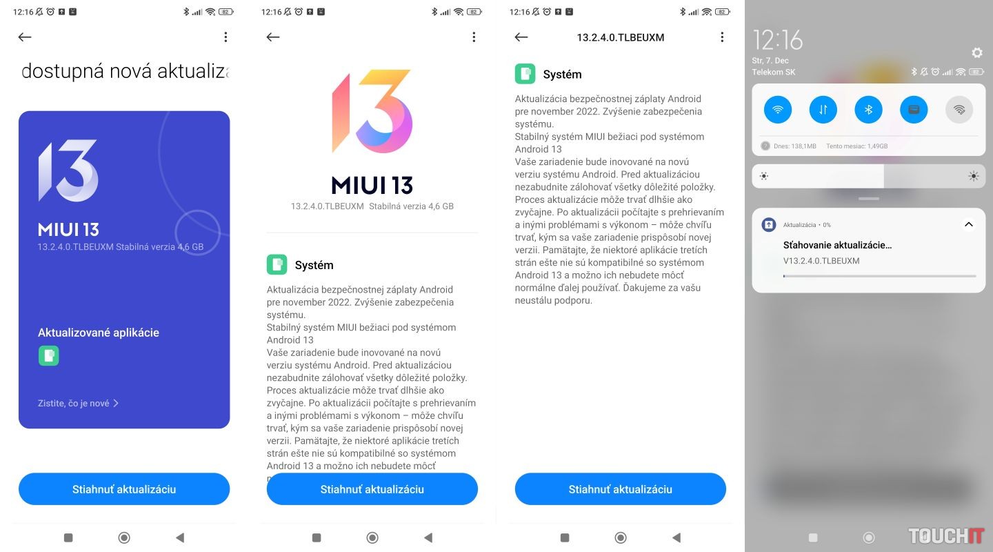 Náš redakčný testovací kus dostal aktualizáciu na verziu 13.2.4.0.TLBEUXM dňa 7. decembra 2022. Aktualizácia má veľkosť 4,6 GB a okrem zlepšení, ktoré prináša systém Android 13 (detailné informácie nájdete v samostatnom článku TU) obsahuje aj bezpečnostné záplaty systému Android k novembru 2022.