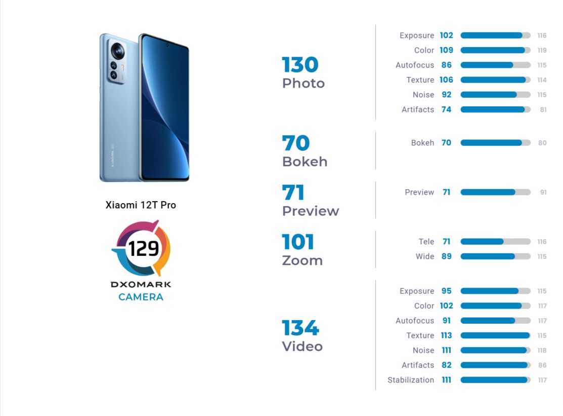 Výsledkom je 129 bodov, čo v celkovom sumáre postačuje na 18. miesto v kvalite fotografií a videa spomedzi všetkých smartfónov, ktoré DXOMARK otestoval. Ak však berieme do úvahy aj cenu, Xiaomi 12T Pro je aktuálne najlepšie hodnoteným telefónom v segmente cenovo dostupných prémiových smartfónov od 600 do 800 dolárov. Novinka od Xiaomi tak má podľa DXOMARK jeden z najlepších pomerov kvality fotoaparátov a ceny.