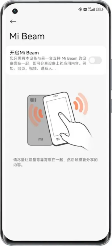 Funkcia Mi Beam je podobná službe AirDrop, slúži teda na rýchly transfer súborov, fotiek či videí medzi zariadeniami. Hlavnou výhodou tejto funkcie je jej rýchlosť pri presúvaní súborov, keďže je výrazne rýchlejšia ako Bluetooth. V minulosti šlo o skutočne pohodlný spôsob, ako presúvať súbory medzi telefónmi Xiaomi a nie je známe, prečo táto funkcia neskôr zmizla.