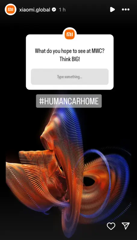 V rámci príbehu na Instagrame sa Xiaomi pýta sledovateľov, čo dúfajú, že bude ukázané v rámci MWC v Barcelone. Ide o otázku, na ktorú môže odpovedať ktokoľvek. Xiaomi však naznačuje, že ukážu niečo veľké, čím prináša otázku, čo vlastne v Barcelone ukáže. Hashtagom #HumanCarHome poukazuje na svoje široké portfólio, no aj na vlastnú identitu značky, ktorá sa sústreďuje na človeka, automobilový priemysel, no aj na domácnosť.
