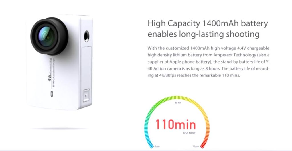 Novinka je rozmerovo o niečo širšia ako predchodca, no stále menšia, ako konkurent GoPro Hero4. Taktiež má vylepšenú kapacitu batérie, z pôvodných 990 mAh na 1400 mAh. To je podstatný rozdiel a „Yi 2“ by mala ponúknuť až 110 minút 4K videa pri 30 fps. Vnútorná pamäť má absenciu a opäť treba siahnuť po kvalitnej pamäťovej karte, do max. kapacity 64 GB. Farebné vyhotovenia budú mierne ochudobnené, s dostupnosťou čiernej a bielej. Zaujímavá zeleno-žltá, zatiaľ v ponuke chýba.