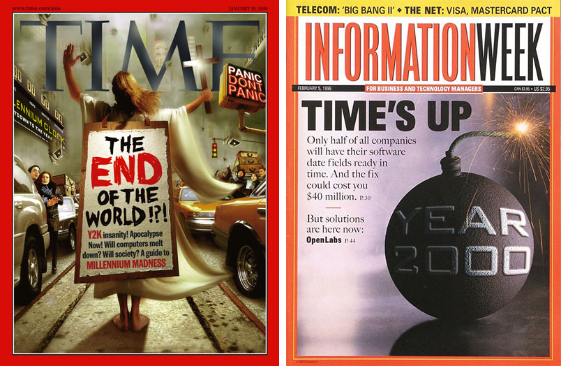 Dobové obálky časopisov Time (Koniec sveta, miléniová šialenosť) a InformationWeek (čas uplynul)