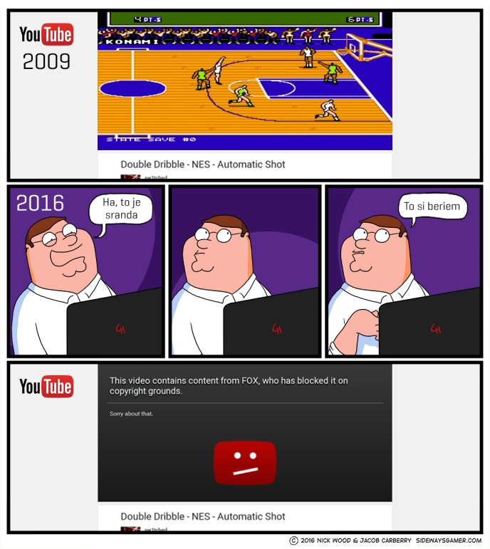 To, že automatický systém detekcie je často veľmi problematický sme mohli zas a znova vidieť na krásne absurdnom prípade, ktorý sa udial v máji tohto roku v súvislosti s americkou televíznou stanicou FOX, ktorá stojí za populárnym kresleným seriálom Family Guy. V epizóde „Run, Chris, Run“ vyzve hlavná postava seriálu svojho suseda na zápas v starej basketbalovej videohre Double Dribble. Táto hra, ktorú na konci 80. rokov vydala spoločnosť Konami, mala zaujímavý bug, ktorý umožnil automatické skórovanie v momente keď basketbalista hodil loptu v presnom okamihu v jednom rohu obrazovky. Na bug upozornil na YouTube používateľ sw1tched, ktorý v roku 2009 z nostalgie uploadoval zhruba 1,5-minútové video, kde bug neustále používal a spomínal pri tom, ako ho odhalil so svojimi bratmi pred viac ako 20 rokmi. O sedem rokov neskôr, tvorcovia Family Guy toto video z YouTube zobrali a použili ho v uvedenej scéne svojho seriálu, kde hlavná postava vďaka bugu zápas s prehľadom vyhrá. V seriáli je toto video použité bez toho, aby si niekto od pôvodného tvorcu vypýtal povolenie. Autor sa o použití dozvedel až potom, keď bolo jeho video na YouTube zablokované na základe toho, že porušil autorské práva televízie FOX. V deň, keď sa seriál vysielal, bol totiž jeho zdroj vložený do automatického kontrolného systému, ktorý overuje, či na YouTube ľudia neuploadujú neautorizované kópie. Automatický systém na základe kontroly našiel 1,5-minútovú zhodu s obsahom seriálu, vyložil si to ako nezákonné uploadovanie scény a video zablokoval.