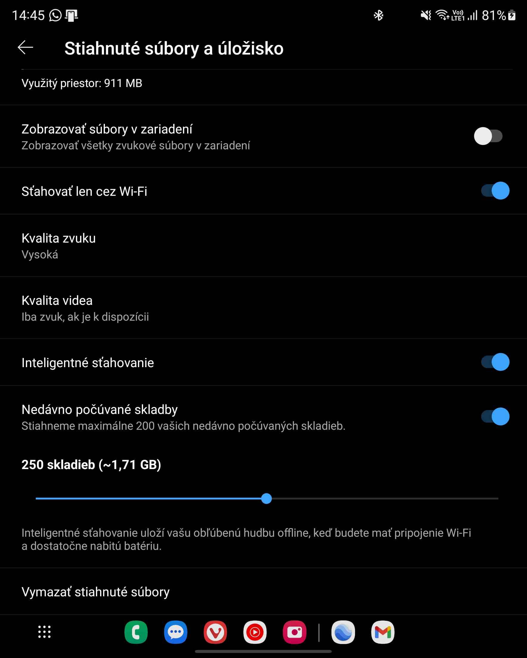 - Aktivácia v systéme Android: Účet > Nastavenia > Stiahnuté súbory a úložisko > Inteligentné sťahovanie (predvolene nastavené na 250 skladieb, max. 500)