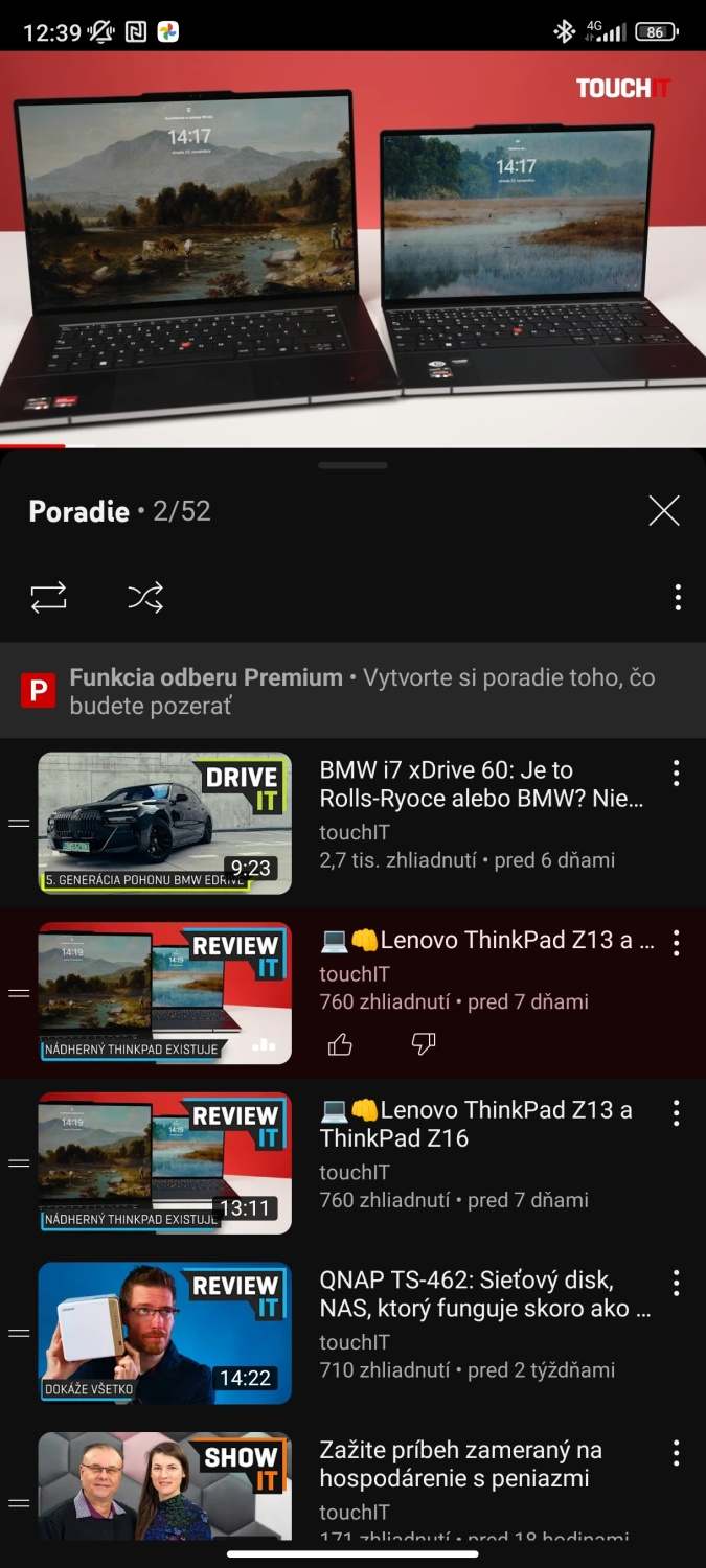 Keď chcete video pridať do Poradia, tak kliknite na ponuku s tromi bodkami a vyberte možnosť „Prehrať ako posledné v poradí„. Zoskupené videá sa zobrazujú v ponuke v spodnej časti obrazovky. Po jej otvorení sa zoznam s videami otvorí v celoobrazovkovom režime. Umožňuje pridanie ľubovoľného videa do zoznamu, v ktorom je možné klipom meniť poradie, ale ich odtiaľ aj vymazať.
