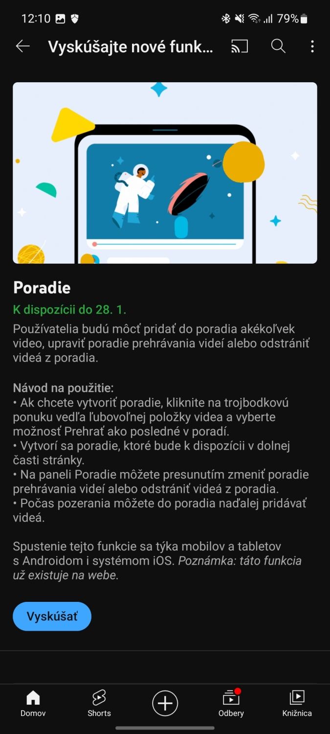 Pokiaľ ste predplatiteľom služby YouTube Premium, tak dostupnosť tejto funkcie sa najskôr zobrazí na hlavnej stránke medzi videami. Keď sa tak nestalo, tak kliknite na profilovú fotografiu – otvorte nastavenia a vyhľadajte položku „vyskúšať nové funkcie„. Po akceptovaní experimentálnej ponuky je potrebné aplikáciu YouTube reštartovať, aby sa funkcia Poradie zobrazila v ponuke. Funkcia sa bude následne zobrazovať pri každom videu po otvorení ponuky s tromi bodkami.