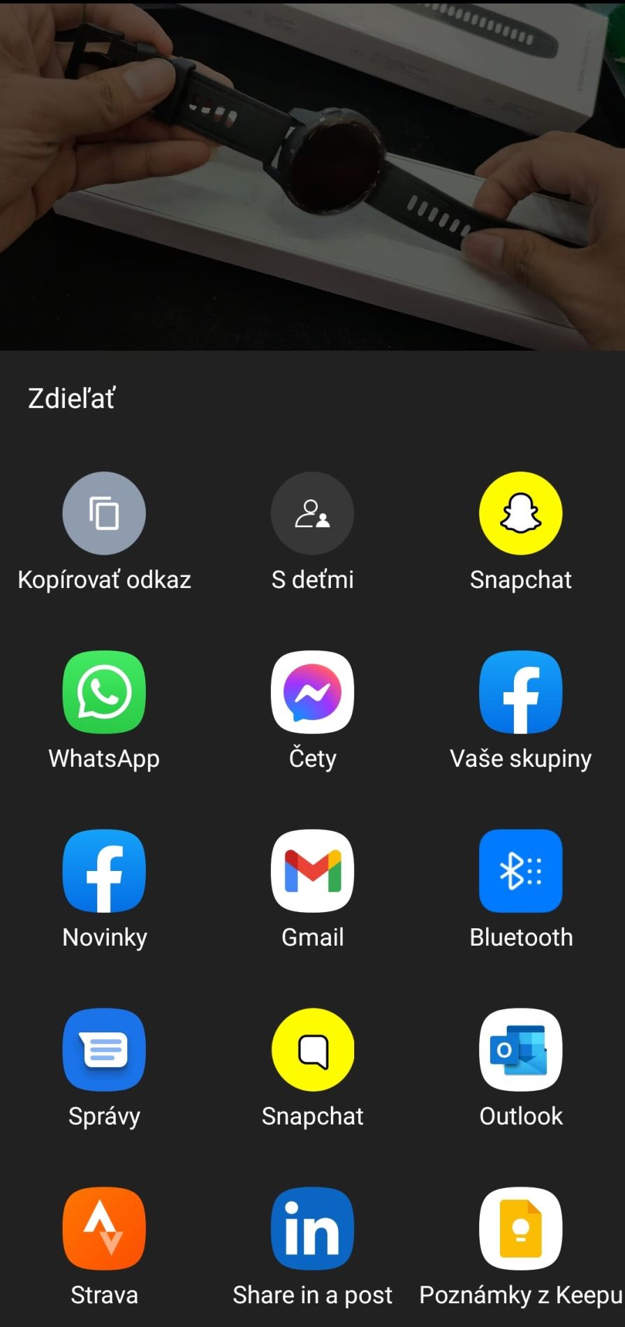 Po otvorení aplikácie YouTube pre Android stačí pod videom ťuknúť na tlačidlo Zdieľať. Pokiaľ máte Snapchat nainštalovaný, tak v hornom rohu ponuky na zdieľanie sa objaví ikona aplikácie Snapchat. Po ďalšom ťuknutí sa už aplikácia otvorí a umožní video vložiť do posledného videa, fotografie alebo príbehu.