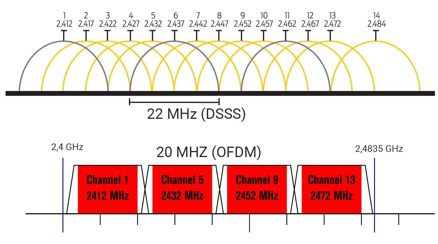 Prekrývanie kanálov 2,4 GHz Wi-Fi pri starších štandardoch s DSSS moduláciou a novších s OFDM moduláciou