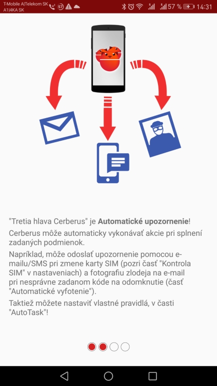 Aplikácia nás zaujala najmä svojimi nadštandardnými funkciami. Sledovanie pomocou Wi-Fi a webového rozhrania je v nástrojoch tohto typu samozrejmosťou. Rovnako tak vykonávanie veľkého množstva povelov, ktoré posielate cez internet. Lenže, Cerberus funguje aj v prípade, že telefón nie je pripojený do internetu, či už cez Wi-Fi alebo použitím mobilných služieb. V takomto prípade je možné posielať príkazy SMS správami a vyžiadať si napr. lokalitu telefónu, čo systémový Správca systému Android neumožňuje. SMS príkazov je skutočne veľa a Cerberus vám ich pošle po vytvorení používateľského konta do emailu, takže si ich môžete naštudovať a otestovať nanečisto. Cerberus takisto ponúka viacero pokročilých nastavení. Okrem iného dokáže znemožniť vypnutie zariadenia, pokiaľ je telefón v uzamknutom stave. Toto je užitočná funkcia, ktorá môže predstavovať dočasnú výhodu. Bežne totiž šikovný zlodej alebo nečestný nálezca telefón vypne a v takom prípade zlyhajú všetky pokusy o vzdialenú diagnostiku. Nakoľko Cerberus po aktivovaní funkcie blokuje vypnutie telefónu tlačidlom napájania, máte k dispozícii pár hodín, aby ste sa ho pokúsili vypátrať alebo získali aspoň nejaké informácie. Aplikácia pomôže aj v prípade, že váš telefón ukradne alebo nájde nešikovný človek, ktorý bude telefón používať bez obnovenia továrenských nastavení. V takom prípade môžete na diaľku využívať zabudovanú kameru v telefóne a získať jeho podobizeň. Cerberus ponúka množstvo nastavení a oplatí sa s nimi pohrať. Služba je dostupná počas prvého týždňa zadarmo. Následne je potrebné zakúpiť prémiové konto za poplatok 5 eur na 1 rok. Obdobie jedného týždňa však ponúka dostatok času na to, aby ste sa s aplikáciou zoznámili, nanečisto si ju vyskúšali a zistili, či vyhovuje vašim podmienkam alebo nie. Faktom je, že nič lepšie v obchode Google Play v tomto segmente nenájdete.