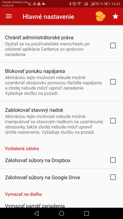 Sekcia hlavné nastavenie umožňuje zakúpiť neobmedzenú licenciu. Hlavne si však nastavte kľúčové slovo pre SMS príkazy, ktoré je potrebné zadať v každej SMS pre účely diaľkového ovládania alebo diagnostiky. Cerberus môžete takisto schovať, chrániť administrátorské práva alebo blokovať ponuku napájania. To je práve tá funkcia, ktorá znemožní vypnúť telefón tlačidlom napájania. Tieto nastavenia odporúčame otestovať.