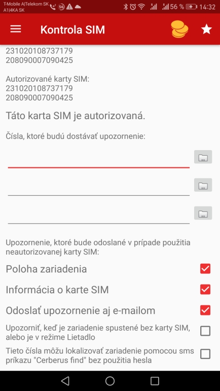 Cerberus umožňuje takisto nastaviť odosielanie automatických upozornení, keď sa do telefónu vloží neautorizovaná SIM karta. Je potrebné zadať telefónne čísla, na ktoré sa budú upozornenia posielať. Túto funkciu odporúčame otestovať nanečisto, či vám bude fungovať korektne.