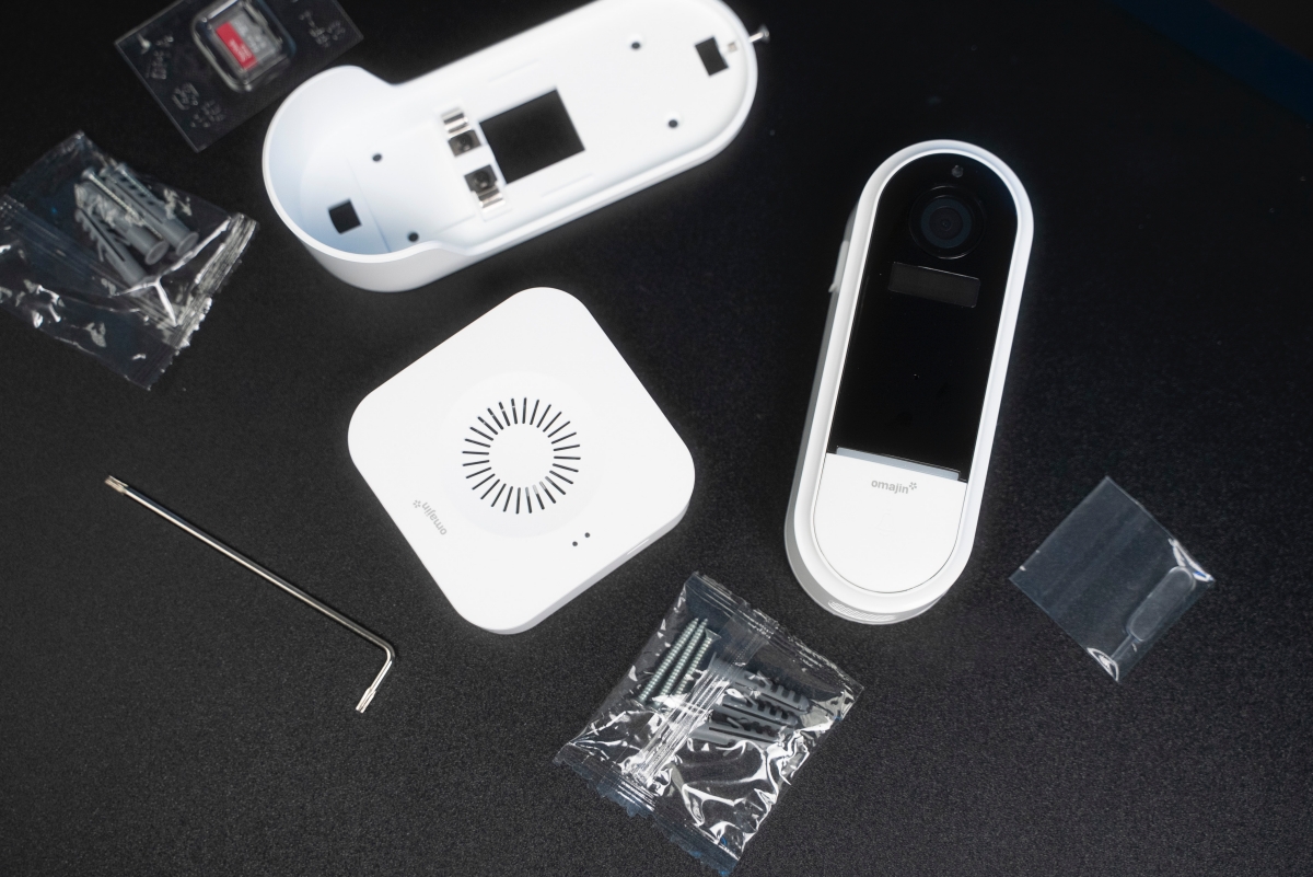 V balení zvončeka Omajin nájdete okrem samotného zariadenia, ktoré pozostáva z vonkajšieho zvončeka a vnútornej hlásnej jednotky, aj montážne príslušenstvo, skrutky, konzolu, nabíjací kábel USB-C a dokonca micro-SD kartu s kapacitou 64 GB.