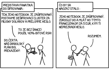 A nemusím byť ani pasívny a čakať kým práve ty heslo zabudneš. Nainštalujem šifrovací program na tvoj notebook bez tvojho zvolenia, dáta zašifrujem a potom ťa hneď naprášim, že tam máš detskú pornografiu. Vybavené. Budeš v cele bitý hadicou za to, že nechceš heslo prezradiť, takže si určite vinný, pretože keby si nebol, tak heslo určite prezradíš a očistíš sa.