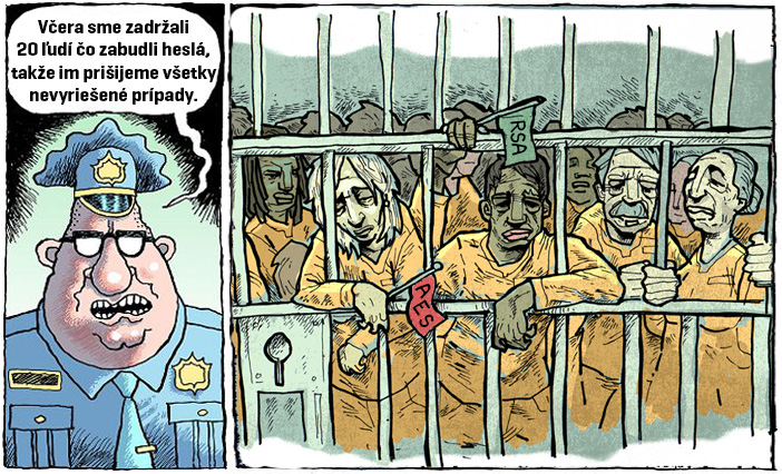 A treba občas plniť aj kvóty vyriešených prípadov no nie? Takže sa treba postaviť za dvere strediska na obnovu dát, a keď tam príde nejaký chudák, že či sa dajú jeho dáta so strateným heslom obnoviť a technik povie že nie, tak hneď ho treba ľapnúť, nasadiť putá a je to. Ty budeš obvinený z tej vraždy čo máme nevyriešenú už dva roky, ty zas zo zneužívania detí a ty čo si priam prišiel s tým zašifrovaným USB kľúčom, ty vyzeráš na to, že chceš zastreliť amerického prezidenta. Všetci ste vinní, lebo sa nechcete priznať a nechcete sa očistiť tým, že urobíte to čo neviete.