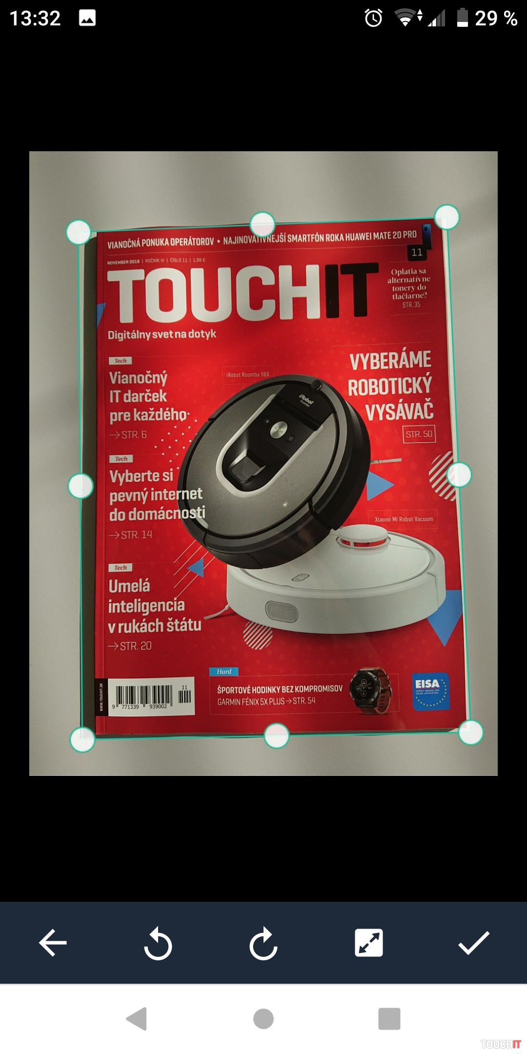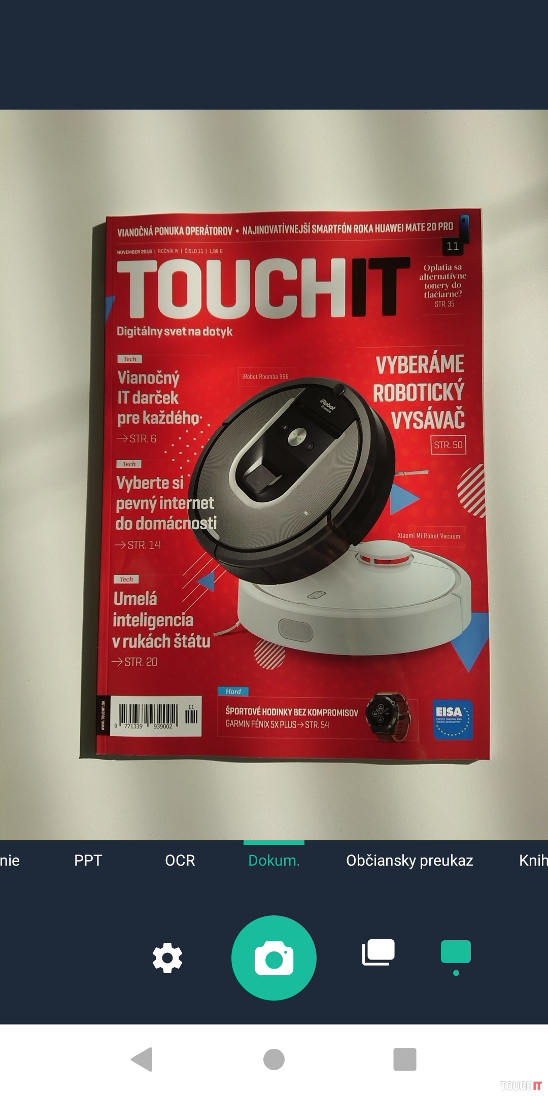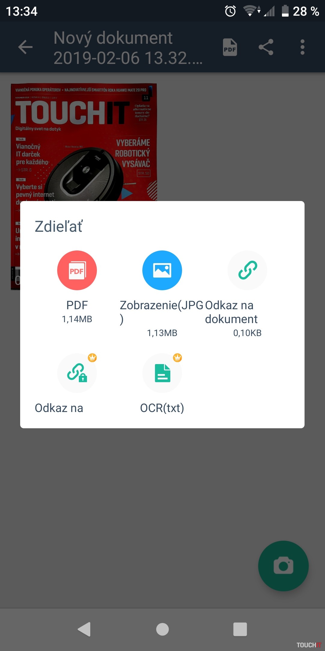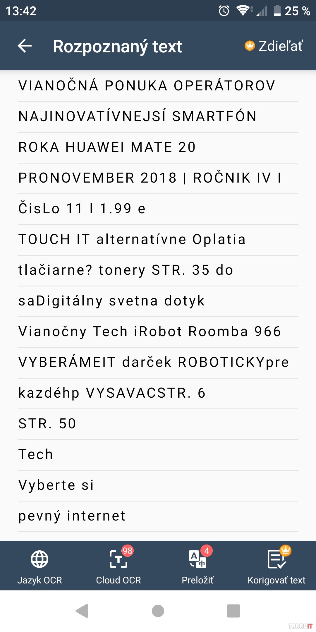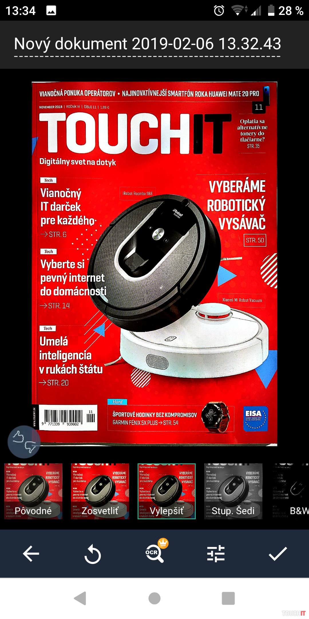 Po potvrdení orezových strán sa dokument presne vyrovná a upraví tak, akoby bol vyhotovený klasickým skenerom. Deformácie nie sú viditeľné. Pokiaľ nie ste spokojní, ako dokument vyzerá, prípadne chcete na ňom zvýrazniť text, tak na tento účel sa dajú použiť rôzne filtre priamo v aplikácii.V prípade potreby sa dajú vyhotovené skeny zdieľať vo forme PDF, obrázka JPG, odkazu alebo OCR. V neposlednom rade, sa dá požadovaný súbor poslať po sieti, priamo do podporovanej tlačiarne. V prípade funkcie OCR ide o vyňatie textu zo súboru a ten je následne prevedený na klasický text. V našom prípade sme vyskúšali aplikáciu na členitej obálke nášho magazínu, z ktorej bol text bol vyňatý bez zaváhania. (ukážka nižšie)Šikovná funkcia OCR vyberie z fotografie text, ktorý jej možné priamo v aplikácii preložiť