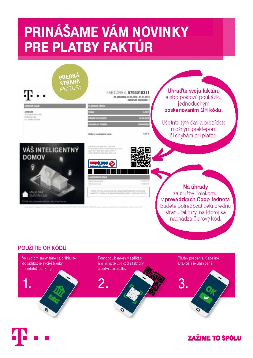 Teraz môžete uhradiť svoju faktúru alebo poštovú poukážku jednoduchým zoskenovaním QR kódu. Ušetríte tým čas a predídete možným preklepom či chybám pri platbe. Na úhrady za služby Telekomu v prevádzkach Coop Jednota budete potrebovať celú prednú stranu faktúry, na ktorej sa nachádza čiarový kód. POUŽITIE QR KÓDU
