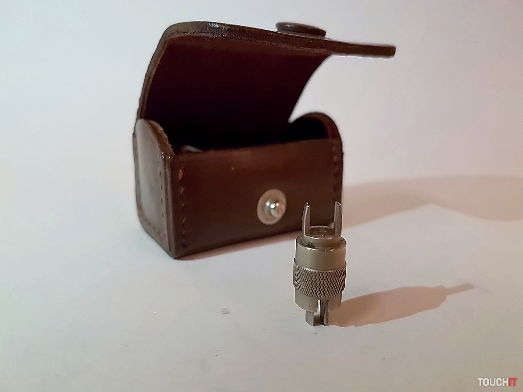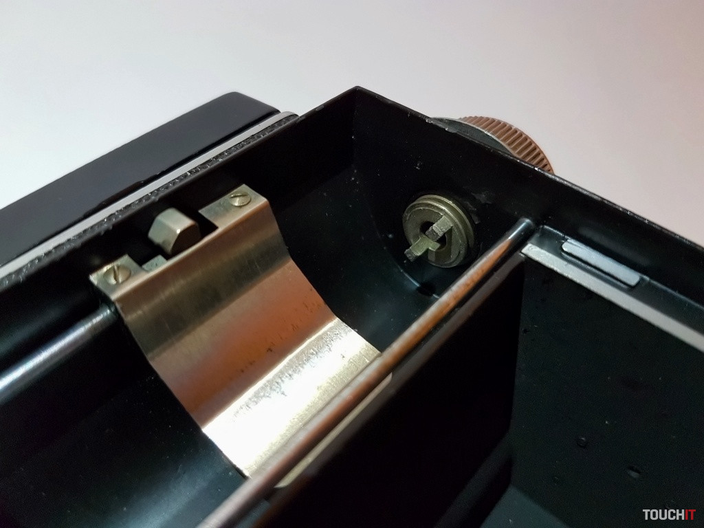 Naťahovanie uzávierky je zakomponované v objektíve snímača, kde sa nachádza aj koliesko nastavenia uzávierky a malý otvor na dávkovanie oleja v prípade potreby premazania.