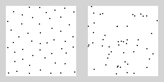 Vysvetlenie tohto javu je ale relatívne jednoduché. Všimnite si dva obrázky vyššie, s „náhodne“ umiestnenými bodkami. Prakticky každému, v tejto súvislosti netrénovanému človeku, bude obrázok vľavo pripadať náhodný, zatiaľ čo ten vpravo značne podozrivý. Obsahuje totiž zoskupenia, tvoriace vzory. Ak vám dám za úlohu na prázdny papier umiestniť 100 bodiek v náhodnom poradí, vyprodukujete obrázok podobný tomu, ako vidíte vľavo. Máte totiž v hlave základnú abstrakciu, že v náhodnom poradí a šume nie sú prítomné žiadne vzory. Podvedome vás to teda láka nevytvárať zhluky a zoskupenia a bodky rozmiestnite relatívne rovnomerne od seba, s nejakými „náhodnými“ malými variáciami. Lenže úmyselné zachovanie takéhoto relatívne rovnomerného rozstupu nie je vôbec náhodné. Drvivý väčšina z takmer nekonečného množstva konfigurácii a polôh bodiek bude vyzerať približne ako obrázok vpravo. Šanca, že bodky budú rozmiestnené relatívne rovnomerne, aj keď poloha každej je náhodná, je extrémne maličká. Ak mi neveríte, môžete si to vyskúšať na tejto stránke. Stačí stláčať refresh. Kým na jednom obrázku sa bodky objavujú celkom nezávisle a náhodne, na druhom je pozícia ovplyvnená a umelo vytvorená tak, aby nevznikali zhluky.