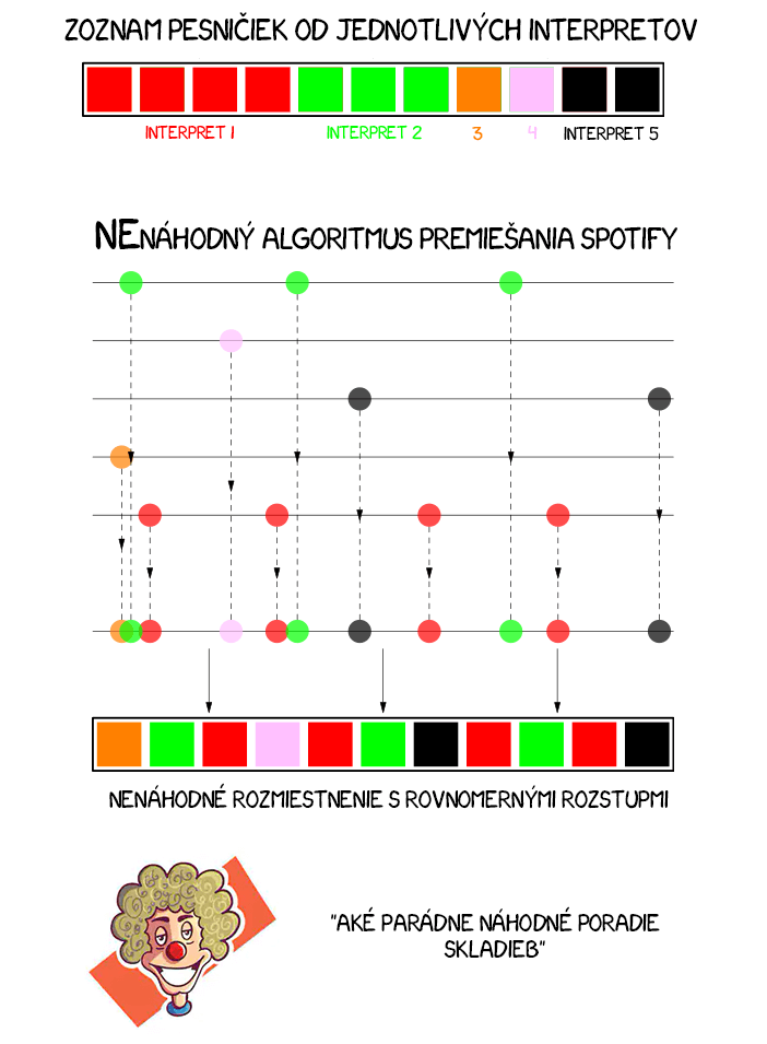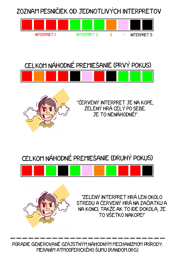 Jednoducho povedané, šlo o malý programový kód, ktorý vezme nejaké dostupné skladby či iné objekty, hodí ich do klobúka a následne z neho losuje a vyťahuje jeden objekt po druhom, až dokým nevyberie posledný. Tento konkrétny algoritmus má len minimálne nároky na prevádzku a zaberá len tri riadky kódu. Jeho výstup je pri tom prakticky perfektne náhodný. Aj keď počítače skutočne náhodný výstup nemôžu produkovať, vďaka vhodným matematickým operáciám sa môžu dostať tak blízko, že človek nemá ako drobnú nezrovnalosť a periodickosť zistiť bez rozsiahlych matematických analýz a obrovského objemu zozbieraných dát. Skladby teda Spotify naozaj prehrávalo náhodne. Prečo teda používatelia cítili, že náhodné nie je a žiadali od služby vyššiu náhodnosť a opravu? Odpoveď je taká, že ľudia majú o náhode obvykle veľmi skreslené predstavy a intuitívne si ju spájajú predovšetkým s neprítomnosťou viditeľných vzorov. A to má za následok to, že poradie alebo zoskupenie niečoho nám pripadá „naozaj“ náhodné len vtedy, keď náhodné vôbec nie je. To je veru poriadny paradox, čo?