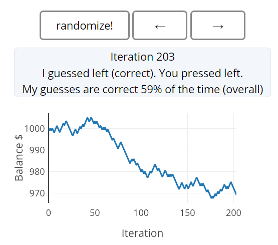 Teraz sa vám asi rozžiarili oči, pretože z vás čo nevidieť urobím boháča. Šanca na rub a líc mince je 50:50, takže to značí, že ak za hodinu mincu hodíte zhruba tisíckrát, získate v priemere 25 euro (500 zaplatíte, ale 525 získate). Ak ju budete hádzať niekoľko dní, môžete prestať chodiť do práce, pretože odo mňa každý deň vyhráte niekoľko stoviek eur. Po čase vás ale prestane baviť mincu vyhadzovať a keďže som k vám otočený chrbtom, začnete si skrátka hádzanie predstavovať a vždy mi len náhodne poviete, že padlo rub alebo líce. Stále mám predsa len 50 % šancu na trafenie, takže je to totožné. Ale ejha. Náhle zistíte, že mince z vášho mešca začnú nepekne rýchlo ubúdať. Neveríte? Vyskúšajte si to na tejto stránke. Nájdete na nej šípku doľava a doprava a takisto virtuálny mešec s tisíckou dolárov. Stláčajte na klávesnici šípku vľavo alebo vpravo (na dotykovom displeji použite poskytnuté tlačidlá) a sledujte stav svojho mešca. Uvidíte, že z nejakého zvláštneho dôvodu vám peniaze začnú s pribúdajúcimi pokusmi ubúdať. Počítač totiž bude hádať to čo stlačíte s viac ako 50 % úspešnosťou. Nie o veľa, ale o dosť na to, aby nielenže zvrátil 5 centový bonus pri zlom tipe, ale začal aj zarábať. Šípky totiž nestláčate dokonale náhodne. Len si myslíte, že to robíte.