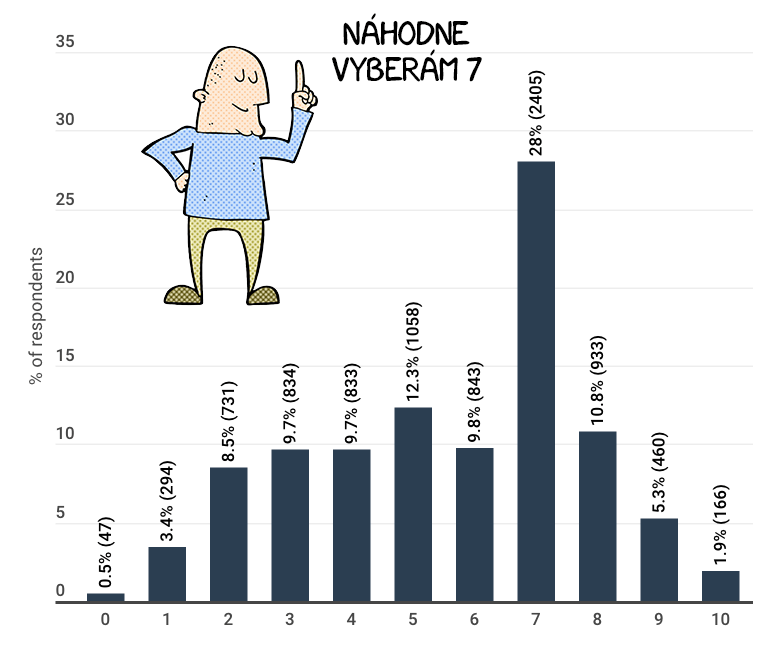 Jeden z obvyklých výsledkov náhodného vybratia čísla od 1 do 10. V tomto prípade náhodne volilo 8604 študentov a tretina „náhodne“ zvolila sedmičku.