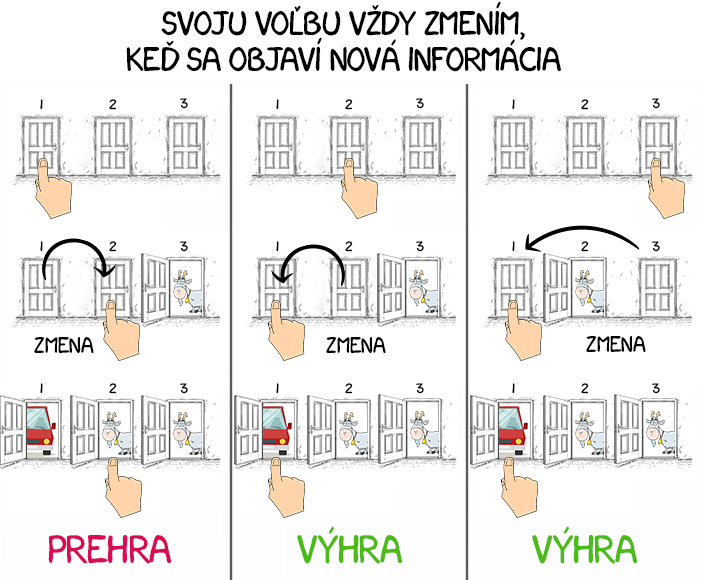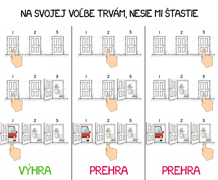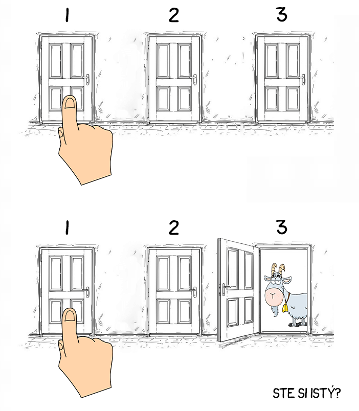 Povedzme, že ste v súťaži, na konci ktorej vás moderátor postaví k trom dverám. Za jednými dverami je auto a za dvomi dverami koza. Vašou úlohou je tipnúť si, kde je auto a ak ukážete na správne dvere, vyhráte ho. Keďže dvere vyzerajú rovnako, skrátka si len náhodne tipnete a ukážete prstom napríklad na dvere č.1. Moderátor sa pritom usmeje a začne vás dráždiť tým, že otvorí dvere č.3, a ukáže, že za nimi je koza. To vás určite poteší, pretože cítite, že ste sa k výhre priblížili. Zostali predsa už len dvoje dvere, takže vaša šanca na výhru je teraz 50:50. Moderátor vám pritom ponúkne, či si to nechcete ešte teraz rozmyslieť a nechcete si vybrať iné dvere, teda dvere č.2. Väčšina ľudí, ktorí tento príklad nepozná, zostane pri svojej predošlej voľbe. Má to dva dôvody. Dvere sú len dvoje, šanca je 50:50, tak na čo meniť, keď jedny som si už vybral. Druhý dôvod je, že už majú k „svojej“ voľbe a rozhodnutiu citový vzťah. Ak by sa na poslednú chvíľu nechali prehovoriť a zmenili výber na dvere, ktoré pôvodne nechceli a tie sa ukážu ako nevýherné, poriadne by si to vyčítali. Lenže problémom je, že v tomto momente by ste svoj výber dverí určite zmeniť mali. Nech to znie akokoľvek čudne, tento akt zmeny dverí zvýši vašu šancu na výhru o celý dvojnásobok. A to nevyhnutne! Toto majú ľudia intuitívne obrovský problém pochopiť a mnohí sú schopní hádať sa až do krvi, že to tak určite nie je, pretože predsa šanca u dvoch dvier je 50:50 a keďže náhoda nemá pamäť, čo sa stalo v minulosti (troje dvere), nemôže predsa byť zrazu iná. Šanca totiž nevie, že ukazujem na jedny dvere z dvojice z minula, alebo až odteraz. To na čo v tejto situácii ale intuitívne zabudneme je, že problém sa na rozdiel od hodu mincou či rulety zmenil a už nie je totožný. V úvode si totiž vyberáme z troch dverí a šanca je 1:3. Následne ale dostaneme novú informáciu o tom, kde výhra nie je a ak svoj výber v tom momente zmeníme, naša šanca na výhru sa zmení na 2:3. Je to naozaj veľmi neintuitívne a často ten pocit v kostiach prekonáte až tým, ak si prejdete úplne všetky možnosti, ktorú môžu nastať.