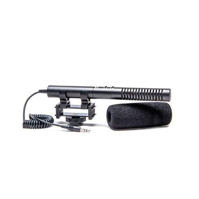 Poslednou súčasťou súpravy je smerový mikrofón, ktorý umiestnite priamo na kameru alebo na fotoaparát a nahrávate okolitý zvuk. Tento mikrofón sa hodí ako ruchový. Protiveterný filter sa dá dať dole, mikrofón sa dá upevniť do kolísky na príslušenstvo. Aj tento mikrofón môžete využiť na nahrávanie zvuku do smartfónu alebo do tabletu. Na sebe má prepínač zapnutia a vypnutia a tiež prepínač na nahrávanie zvuku z krátkej a dlhej vzdialenosti.