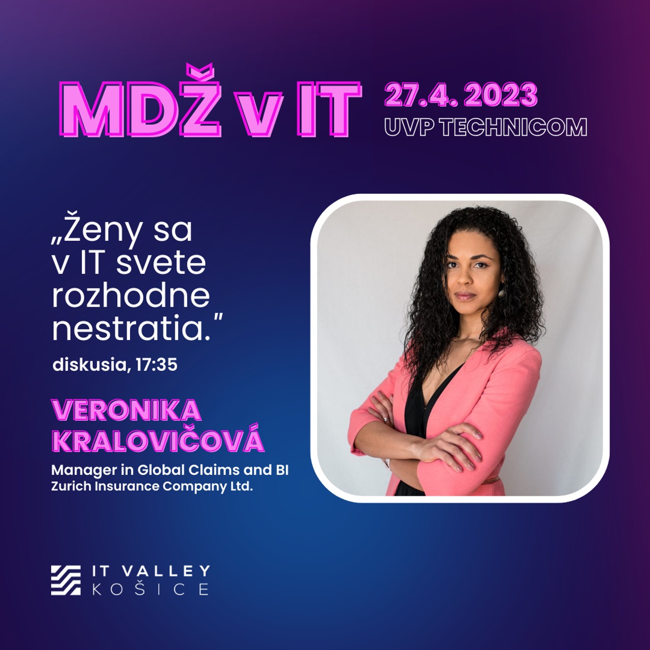 Svoj príbeh nám porozprávala aj Veronika Kralovičová z Zurich Insurance Company, ktorá vystúpi 27. apríla 2023 na konferencii v rámci Medzinárodného dňa žien v IT v Košiciach. Ak si chcete vypočuť jej inšpiratívny príbeh na tému “Ženy sa v IT svete rozhodne nestratia,” neváhajte sa registrovať prostredníctvom online formulára. Vstup na podujatie je bezplatný.