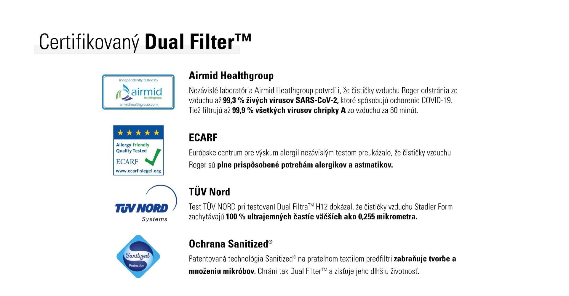 Dôležité je pri prevádzke čističky filtre po istom čase vymeniť. Na tento fakt vás upozorní samotná čistička, ale tiež máte pri vybraných čističkách toto hlásenie v prepojenej mobilnej aplikácii. Náhradný filter do väčšej čističky od Stadler Form stojí 69 eur a jeho výmenou získate opäť kvalitné čistenie vzduchu na celý rok. HEPA filtre sú vybavené aj uhlíkovou časťou, ktorá zachytáva napr. aj cigaretový dym, ale aj zápachy z varenia. HEPA filtre od Stadler Form majú tiež certifikáciu na odstraňovanie vírusov chrípky typu A a koronavírusov.
