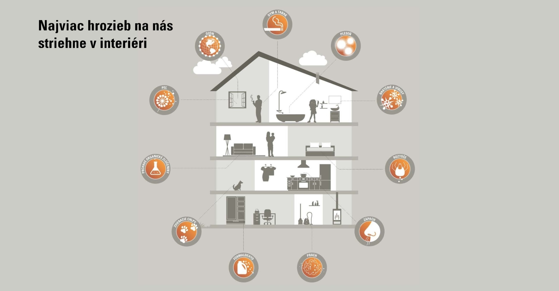 V domácnosti nás najčastejšie ohrozujú alergény roztočov, ktoré sú súčasťou domáceho prachu. Potom sú to zvieracie alergény a čiastočky znečistenia vzduchu preniknuté z vonkajšieho prostredia. Treba počítať aj so sezónnymi alergénmi napr. na prelome mája a júna z brezovitých stromov, burinovitých tráv.