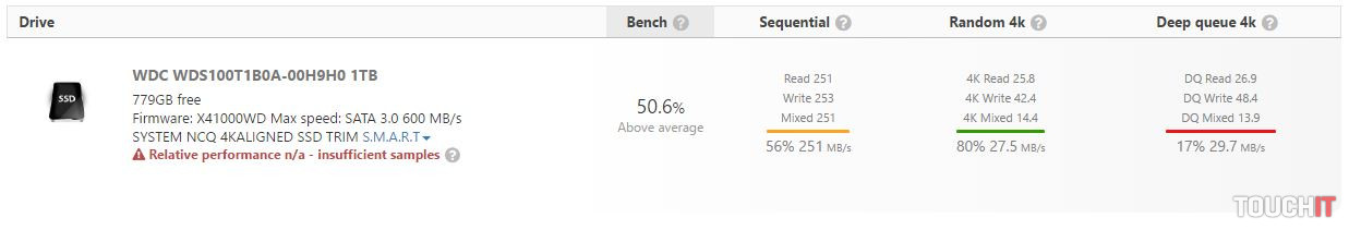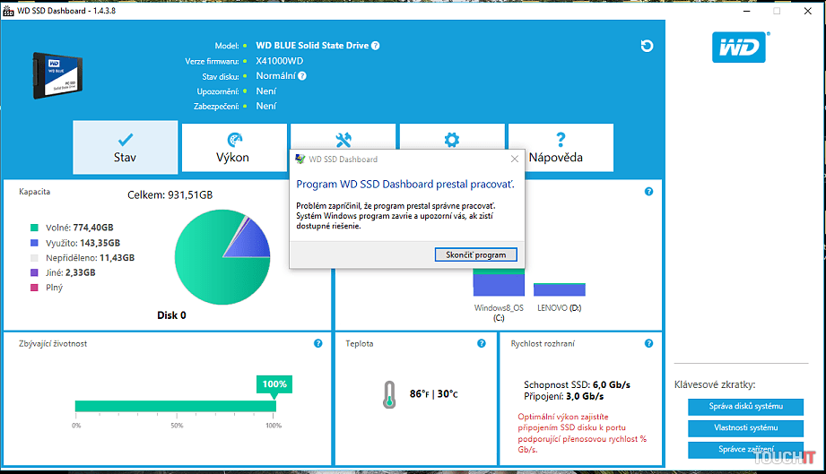 Po integrácii SSD disku odporúčame stiahnuť softvér od výrobcu – WD SSD Dashboard, ktorý monitoruje výkon disku, ostávajúcu kapacitu, rozdelenie partícií, životnosť, teplotu disku, rýchlosť rozhrania a verziu firmwaru (nám tento softvér nefungoval celkom tak, ako by mal, síce všetky údaje zobrazoval, ale po chvíľke prestal pracovať).Tabuľka výkonnosti a parametrov notebooku, v ktorom je disk testovaný. Je to veľmi slabý stroj, ale s SSD diskom sa dá bez väčších problémov používať.