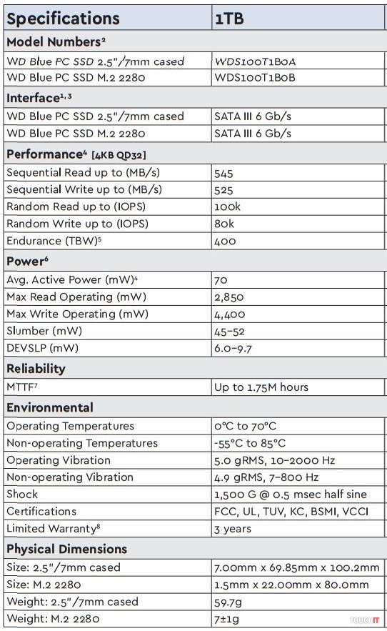 SSD disk WD Blue má strednú dobu medzi poruchami (MTTB) až 1,75 milióna hodín (okolo 15 rokov). A dosahuje odolnosť až 400 TBW. Maximálna rýchlosť čítania je 545 MB/s a zápisu 525 MB/s.