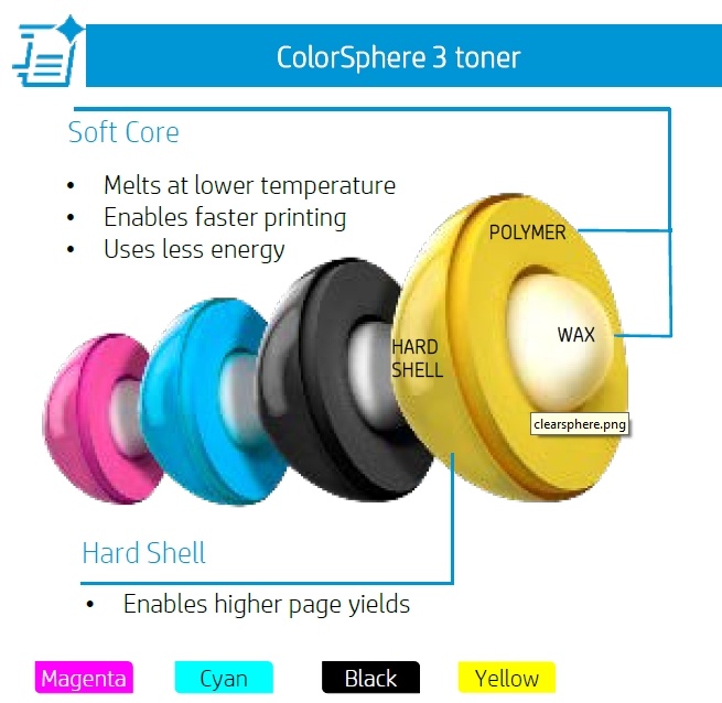 Spoločnosť HP je na poli laserovej technológie aktívna už 30 rokov a teraz prináša ďalšiu inováciu. Je ňou špeciálny toner. Ten vo svojom základnom skupenstve vyzerá ako tekutina. Presnejšie povedané, máte pocit, že vo fľaši je zahustený nápoj. Tento efekt je dôležitý aj v rámci šetrenia tonerom. Poznáte situáciu, kedy z laserovej tlačiarne vyberáte toner, aby ste s ním pohrkali, keď sa míňa. Toto už nebude nutné a aj preto je výťažnosť vyššia a nebudete zahadzovať toner, ktorý síce ešte v obale je, no reálne ho neviete dostať na valec. Vo výsledku ide o guľôčky, ktoré sú zložené z troch vrstiev a z plášťa, ktorý je najtvrdší, potom z polyméru a nakoniec vo vnútri je jadro vo forme vosku. Toner sa nazýva ColorSphere 3 a topí sa pri nižší teplotách, než doterajší toner. Je teda prirodzené, že aj tu sa bavíme o výraznej úspore elektrickej energie. Zároveň je implementovaná technológia, ktorá odhalí neoriginálne tonery. Používatelia budú vedieť, že nepoužívajú originálny toner, ktorý by sa v opačnom prípade mohol zaň vydávať. Nie vždy totiž môže byť pre bežného používateľa možné odhaliť podvrh. Zariadenie bude teraz na displeji zobrazovať, či sa rozpoznal originálny toner alebo nie.